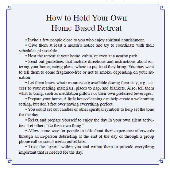Mary Wright sums up her home-based retreat experience in another way: “It really is different without words. There is a communication of being going on. We are each in our own meditative state, and we also share that experience with others.”