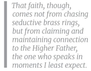 Indeed, to move ahead, we must look back—maybe using a form of narrative therapy Ms. Lonc employs, maybe sharing with a friend, as I did with mine. But we can’t stay stuck there. And that means, for me at least, looking beyond the disease and reaching, stretching, confident that, yes, this time everything will be fine, in fact everything is fine, right here, right now, whatever distractions or delusions may try to shake that belief. That faith, though, comes not from chasing seductive brass rings, but from claiming and maintaining connection to the Higher Father, the one who speaks in moments I least expect.