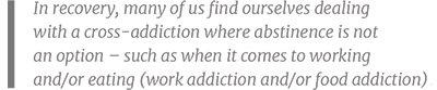 For me, a cross addiction or cross addictive behavior is characterized by the fact I do that thing, or behavior, to excess, and to the detriment of my well-being, relationships, and recovery. Even as my business became more established, my hours did not decrease. My relationships were impacted, my health suffered, and I was taking on more work than I could reasonably be expected to handle – which just led to more hours. All I did was work. All I talked about was work. Heck, all I thought about was work. Starting to sound familiar?
