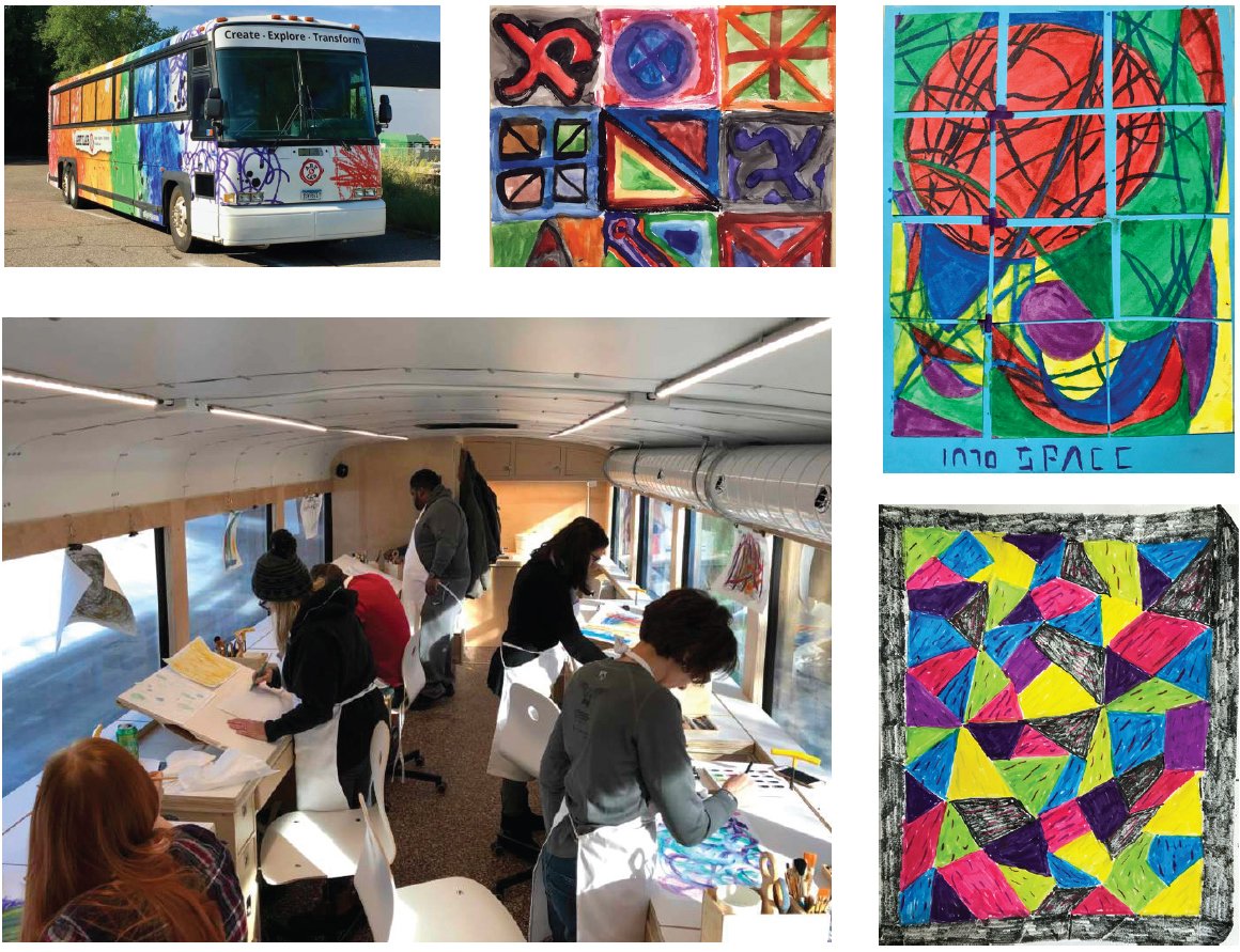 Top left and bottom left: Art Lab Rx’s “Maggie” mobile art studio. Remaining images: artwork from Wendy Frieze clients.